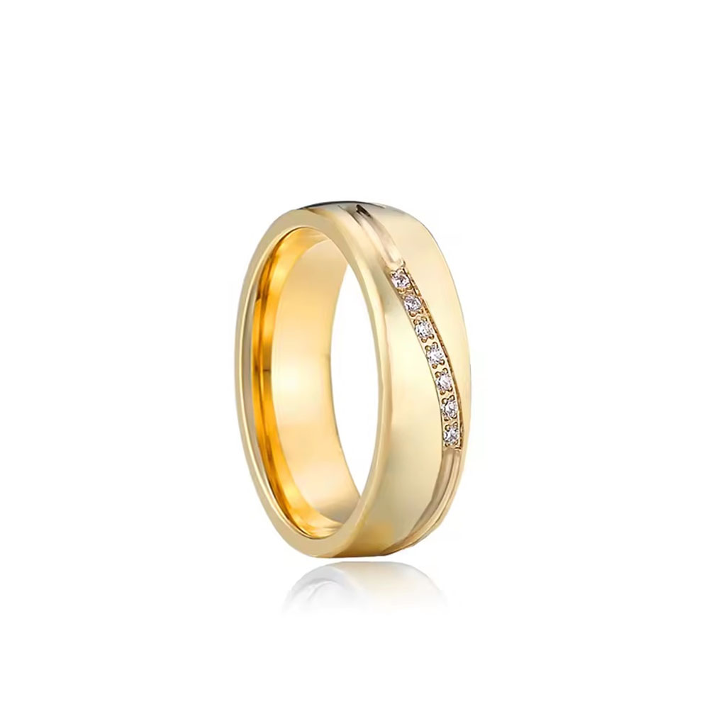 A női gyűrűt briliáns formára csiszolt cirkóna kövek díszítik.