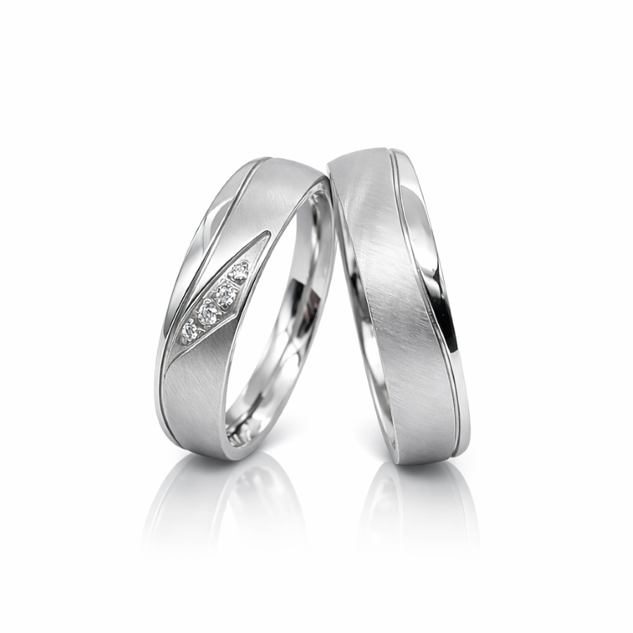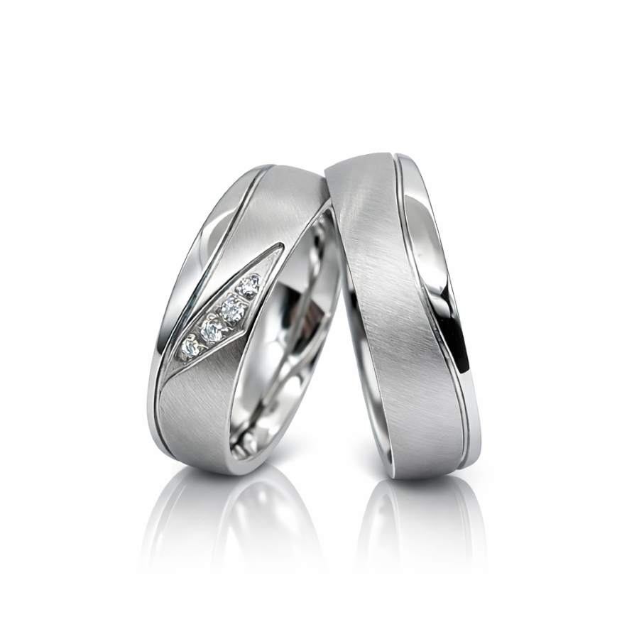 A női gyűrűt briliáns formára csiszolt cirkóna kövek díszítik átlós elhelyezésben.